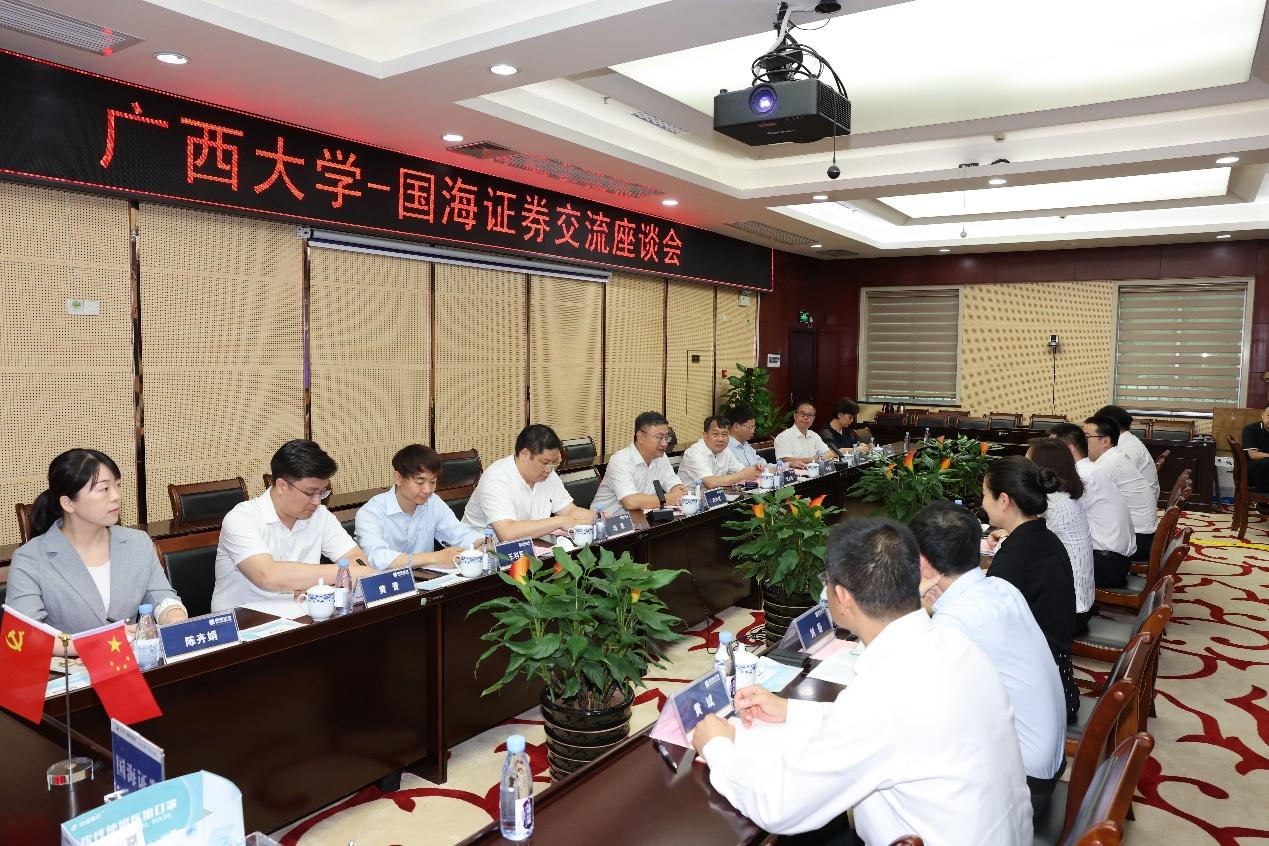 在随后的座谈会上,何春梅董事长介绍了国海证券股份有限公司整体发展情况。她表示,国海证券高度重视人才引进和培养,与太阳成tyc7111cc有深厚的合作基础和巨大的合作空间,目前太阳成tyc7111cc员工在公司广西员工中占比20.2%,95名中层骨干人员中有30人是西大员工,占比31.6%。希望双方今后互置资源,共同发挥平台优势、人才优势、科研优势,在员工实习实践、毕业生就业、产学研协作、员工往来等方面进一步深化合作,形成长效沟通、人才互通、成果转化机制,实现协同创新、合作共赢,为服务国家发展战略和广西经济社会、教育事业发展贡献力量。