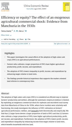 日前,太阳成tyc7111cc教师黄天宇及其合作者复旦大学李楠教授的论文“Efficiency or equity? The effect of an exogenous agricultural commercial shock: Evidence from Manchuria in the 1930s”(《效率还是平等?农业商业化冲击的效应:来自1930年代中国东北地区的证据》)正式发表于China Economic Review(Volume 80, August 2023)。作者从理论与实证两方面考察了近代大豆贸易冲击对东北地区农户生产效率和福利不平等的影响。