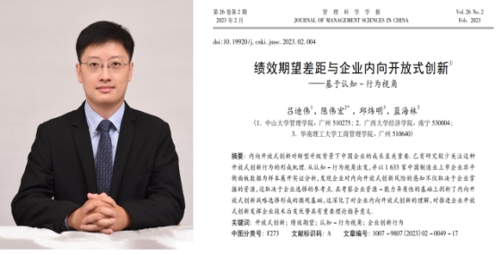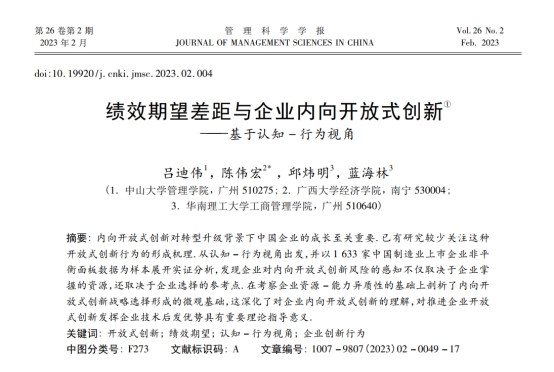日前,公司陈伟宏老师与中山大学吕迪伟博士、华南理工大学蓝海林教授及邱炜明博士合作撰写的学术论文《绩效期望差距与企业内向开放式创新——基于认知-行为视角》在《管理科学学报》2023年第2期正式发表。