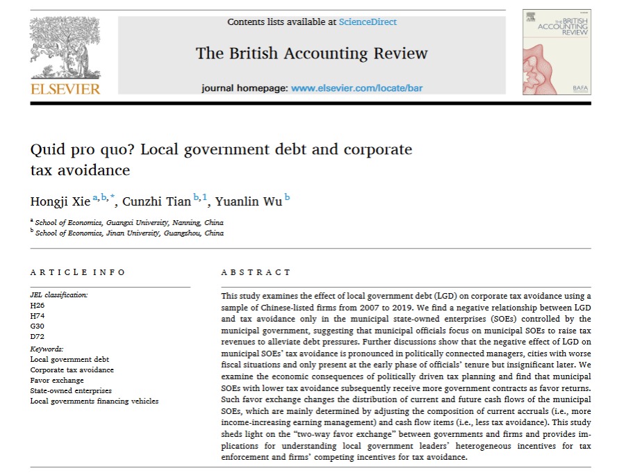 日前,公司谢宏基助理教授、暨南大学田存志教授、暨南大学博士研究生吴远霖合作的论文“Quid pro quo? Local government debt and corporate tax avoidance”,在会计领域国际权威期刊The British Accounting Review在线发表。