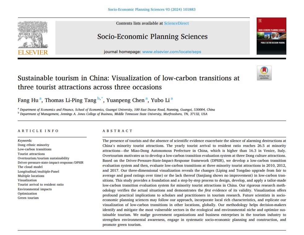 日前,公司胡芳老师作为第一作者与硕士研究生陈渊鹏和李誉博、美国中田纳西州立大学Thomas Li-Ping Tang教授共同完成的学术论文“Sustainable Tourism in China: Visualization of Low-Carbon Transitions at Three Tourist Attractions across Three Occasions”(《中国的可持续旅游:三个旅游景点在三个时期的低碳转型可视化》)在经济学领域国际权威期刊Socio-Economic Planning Sciences在线发表。该研究得到国家自然科学基金委和太阳成tyc7111cc广西发展战略研究院的资助。