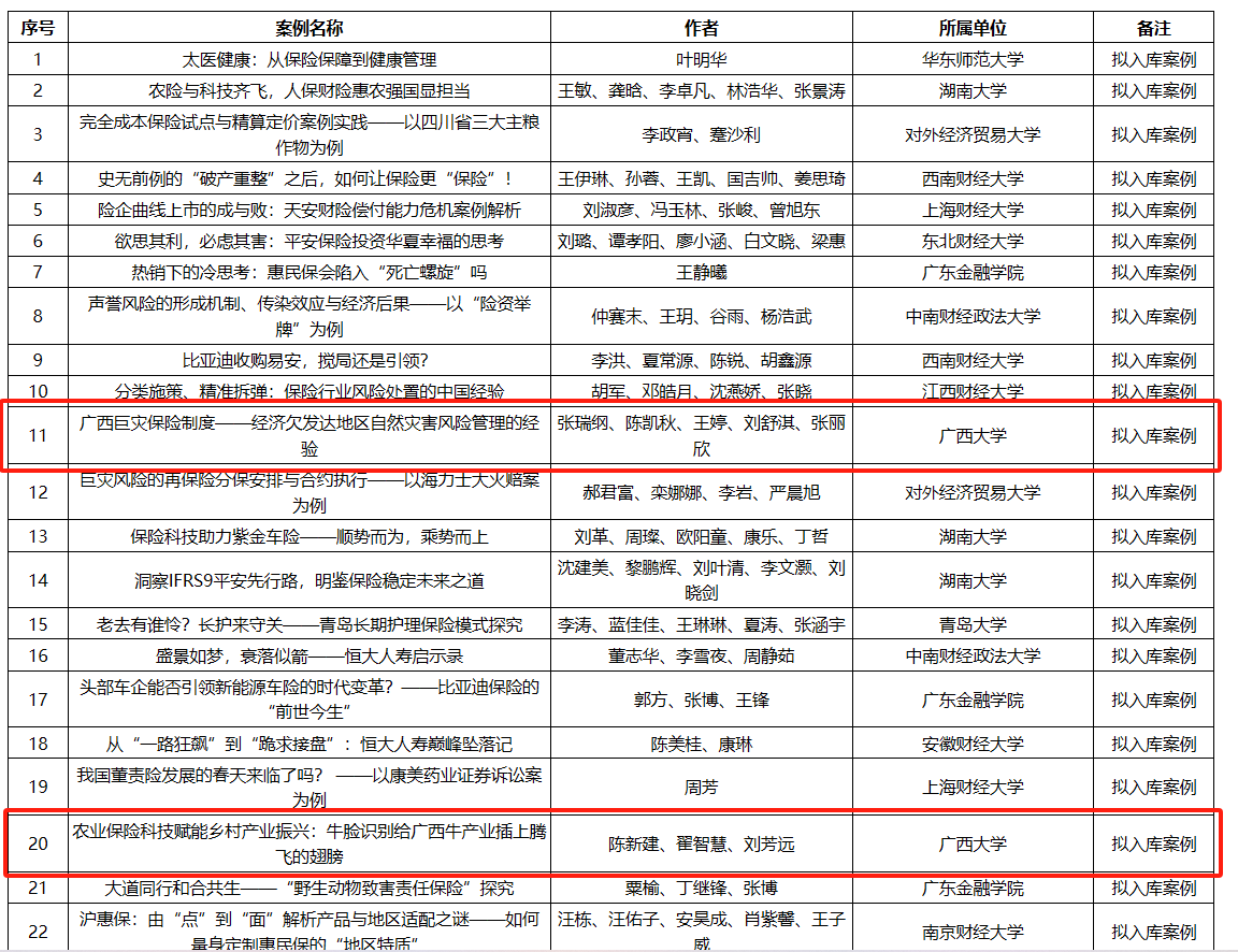 本次案例征集活动于2023年9月启动,经过严格的匿名评审与专家审议流程,全国共有23篇案例入选。公司张瑞纲副教授为第一作者,2022级保险专业硕士生陈凯秋、王婷、刘舒淇、张丽欣参与撰写的案例《广西巨灾保险制度——经济欠发达地区自然灾害风险管理的经验》;以及陈新建教授为第一作者,2023级保险专业硕士生翟智慧、刘芳远参与撰写的案例《农业保险科技赋能乡村产业振兴:牛脸识别给广西牛产业插上腾飞的翅膀》,成功入库全国保险专业学位案例库。
