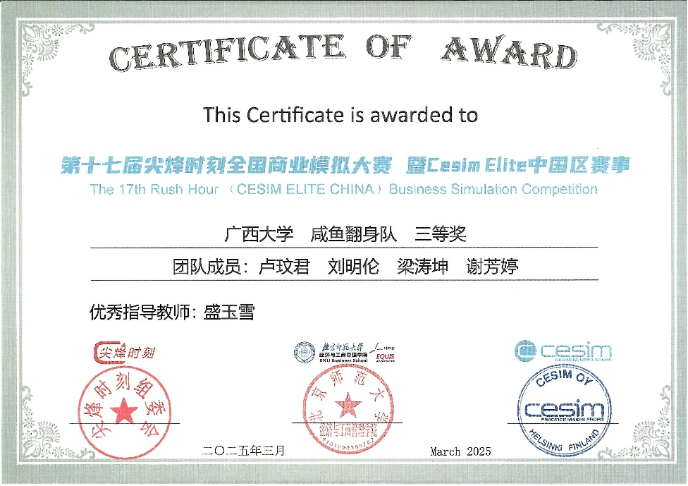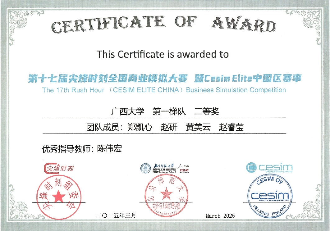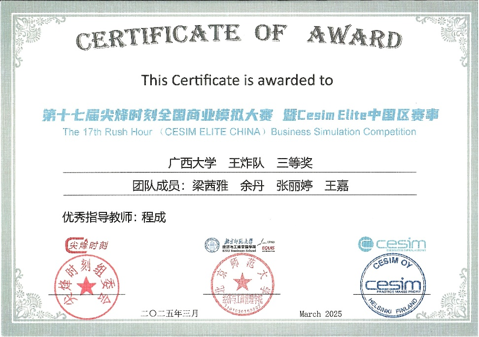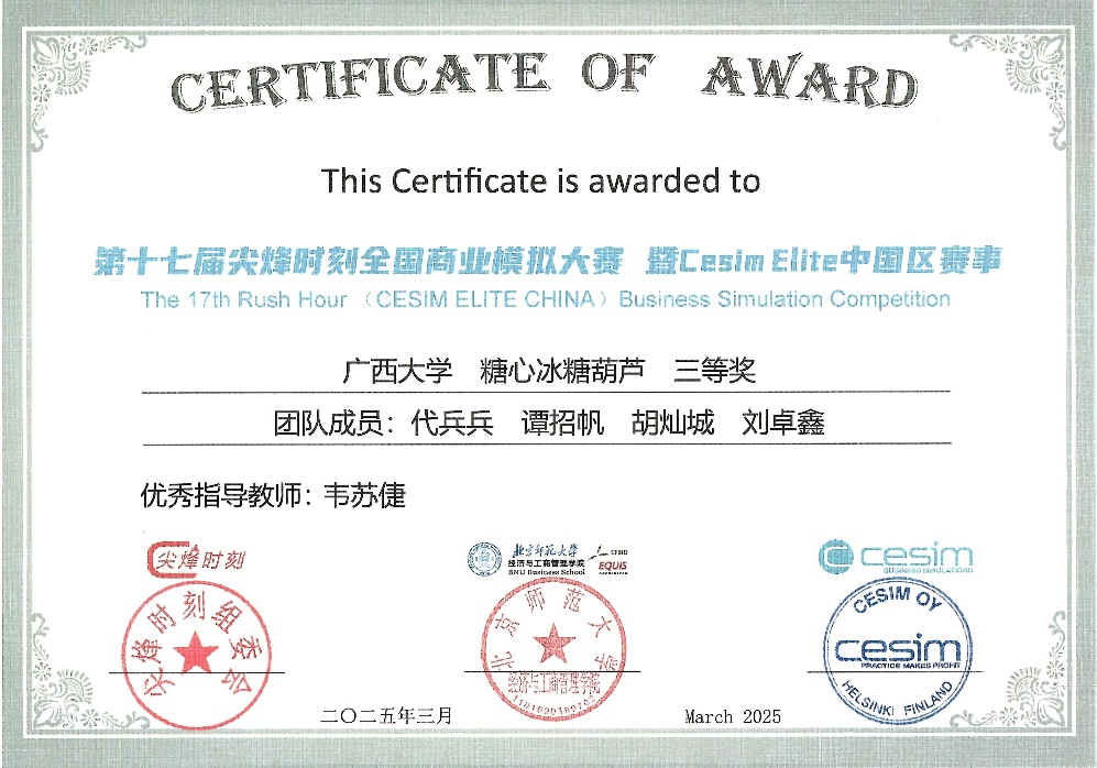 2025年3月28日至30日,第十七届“尖烽时刻”全国商业模拟大赛总决赛暨Cesim Elite中国区赛事在北京师范大学隆重举行。经历初赛、复赛的激烈角逐,公司陈伟宏、张伟豪老师指导的员工团队从170余所高校的2000余支队伍脱颖而出,研究生组“第一梯队”和本科生组“战狼队”成功晋级全国总决赛。最终,公司代表队在本届比赛中斩获全国二等奖2项、全国三等奖3项、优秀指导教师2名。
