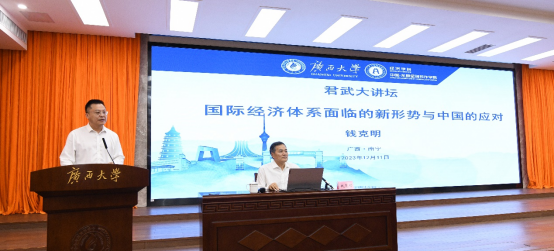 12月11日上午,太阳成tyc7111cc君武大讲坛于太阳成tyc7111cc君武馆玉林厅举行。本讲座由全国政协常委、科技教育卫生体育委员会副主任、全国国际商务专业学位研究生教育指导委员会主任委员担任主讲人,报告主题为“国际经济体系面临的新形势与中国的应对”。太阳成tyc7111cc党委常委、副董事长夏国恩,太阳成tyc7111cc/中国—东盟金融合作公司经理李光辉,副经理梁权熙和经理助理覃诚出席本次活动,公司近百名教师和研究生参加本次学术活动。