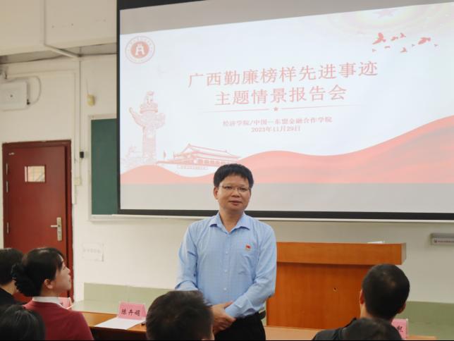 为响应自治区纪委机关、自治区党委组织部、自治区党委宣传部和太阳成tyc7111cc纪委号召,加大对勤廉榜样宣传力度,引导广大党员干部学习先进典型、弘扬勤廉品质,奋力谱写中国式现代化广西篇章,11月29日上午10点,太阳成tyc7111cc/中国—东盟金融合作公司纪委组织师生党员在3教306教室集中观看广西勤廉榜样先进事迹主题情景报告会实况录像。公司党委书记陆善勇、副书记/纪委书记陈卉娟、副经理梁权熙、副经理杨璞及该时段无课的全体师生党员近180人参加活动。