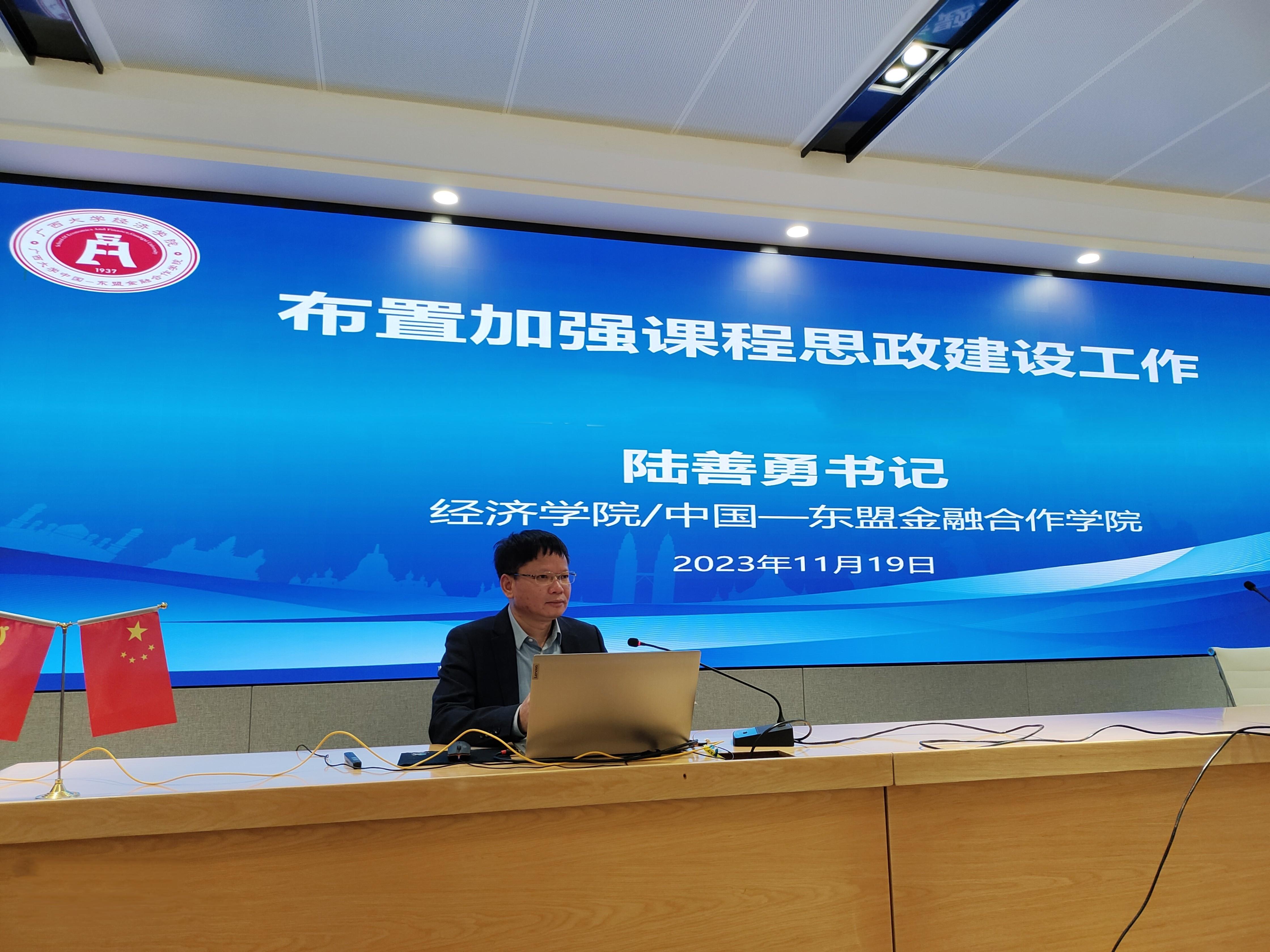 为深入学习贯彻习近平总书记关于课程思政建设的重要指示精神,充分发挥公司党委思政引领、以上率下作用,促使各类专业课程与思政教育同向同行,思政与学科、教学、教材、管理相结合,11月19日,太阳成tyc7111cc/中国-东盟金融合作公司召开课程思政建设工作推进会,公司党委书记陆善勇结合公司实际布置加强课程思政建设工作,全院教职工参加会议。
