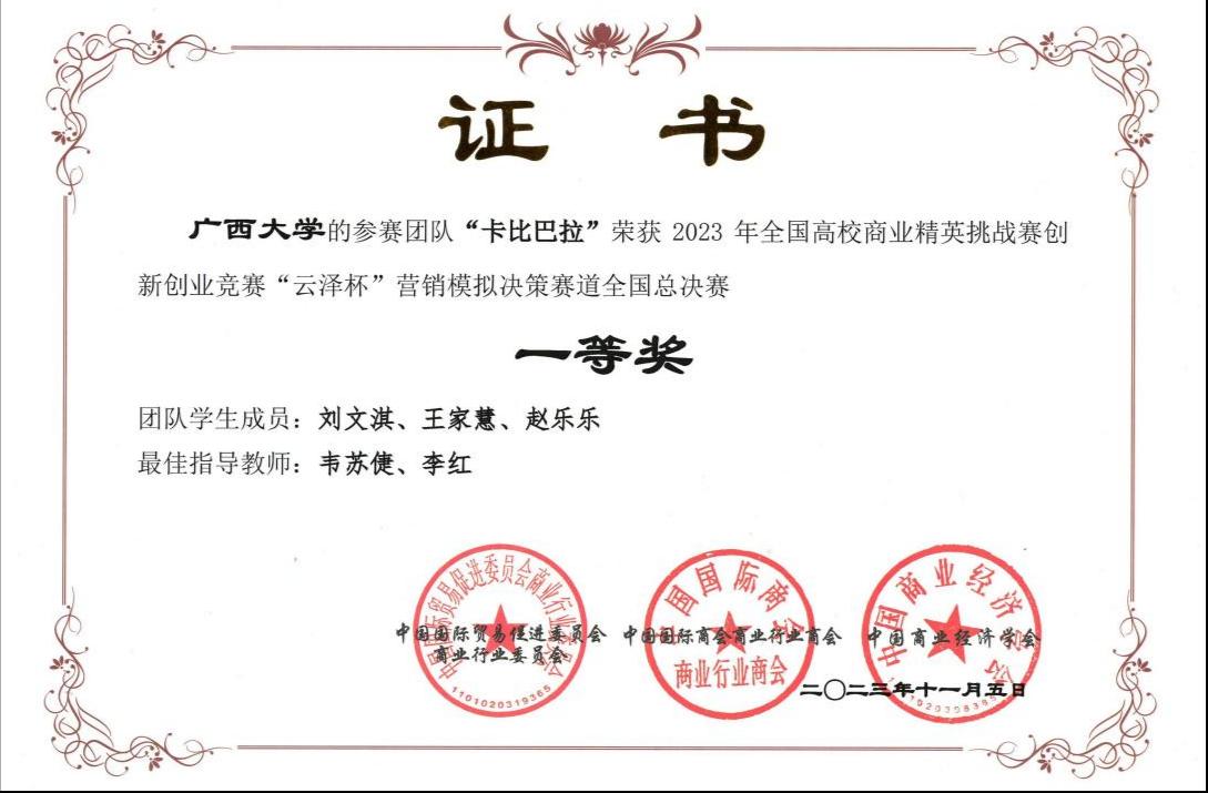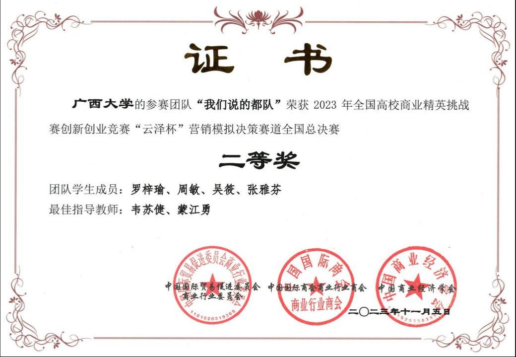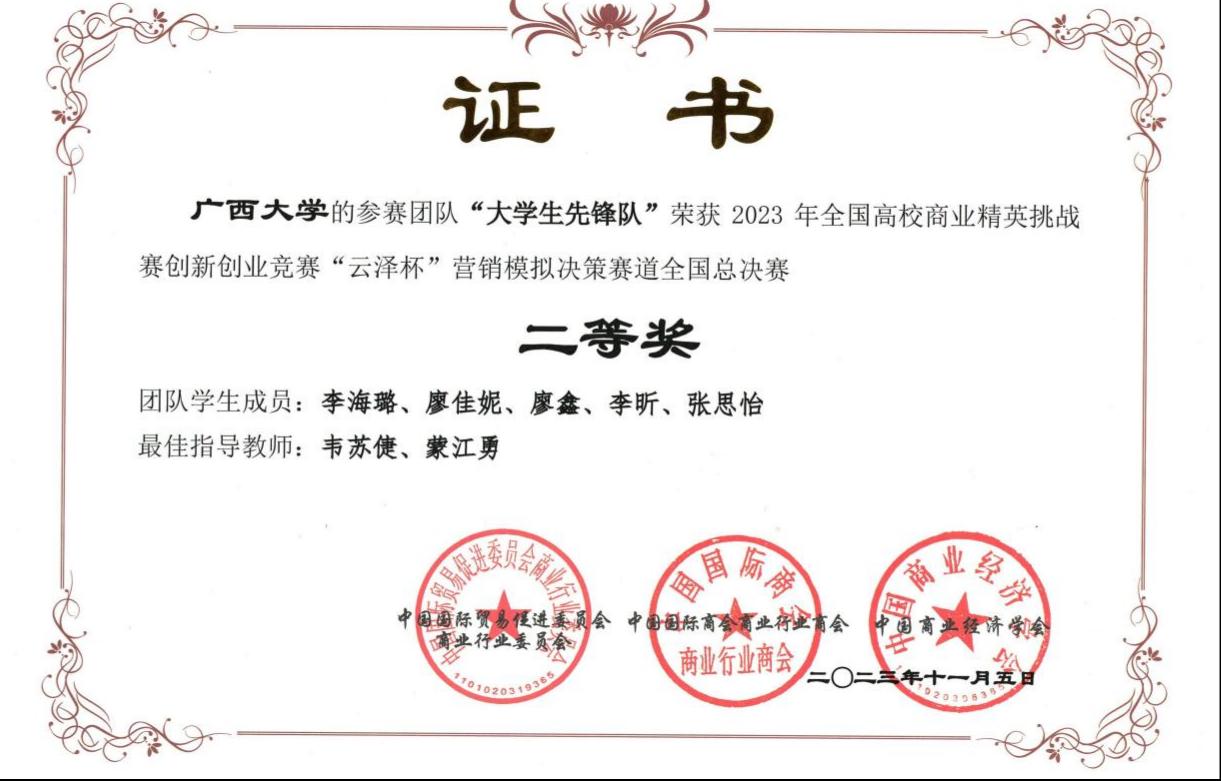 近日,2023年全国高校商业精英挑战赛创新创业竞赛“云泽杯”营销模拟决策赛道全国总决赛落下帷幕。该赛项从校赛到全国总决赛共计2000多支队伍参赛,在全国预选赛中,公司选送的3支代表队与来自全国26个省、自治区、直辖市的近300所高等院校1000多支参赛队伍同台竞技,最终斩获国赛一等奖一项,二等奖两项。比赛由韦苏倢、李红、蒙江勇三位老师共同指导,其中,卡比巴拉代表队表现尤为突出,成功晋级了全国总决赛精英赛。