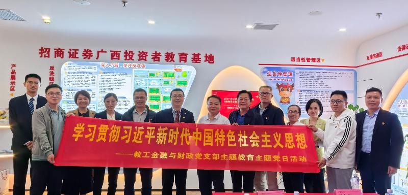 梁权熙副经理和支部书记陈新建带领的9人党员队伍,前往招商证券桂林营业部调研并开展支部联建活动。桂林营业部总经理周毅热情接待了来访的党员教师代表,向党员教师们详细介绍了招商证券广西投资者教育基地及招商证券桂林营业部的发展情况。调研过程中,双方就公司与招商证券广西公司进一步深化合作、开展党建+业务的深度融合、开展资本市场相关课题研究、金融人才创新培养与实习就业等方面开展了深度的交流,并达成了多个初步合作意向。在支部联建活动中,支部书记陈新建详细介绍了教工金融与财政党支部的建设情况和通过学习贯彻习近平新时代中国特色社会主义思想主题教育后所取得一系列成果,招商证券桂林营业部总经理、支部书记周毅围绕红色金融史领学了习近平新时代中国特色社会主义思想关于资本市场发展和金融支持实体经济的系列论述和思想理论。