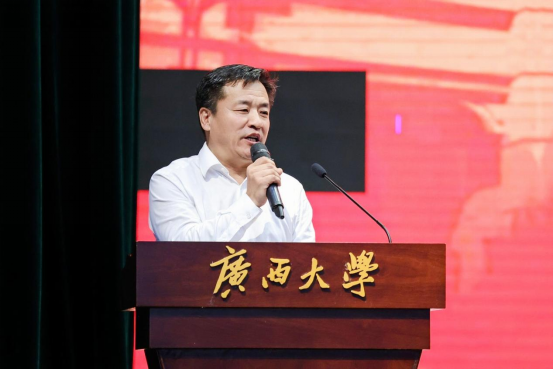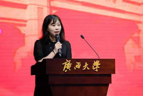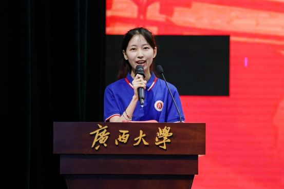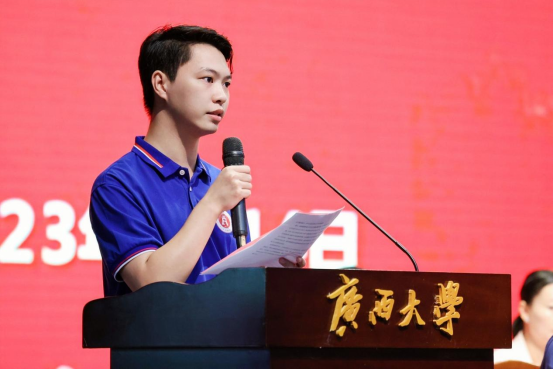 2023级学硕张若楠同学首先代表新生发言。她分享了自己对老员工活的期待和憧憬,表达了努力学习成才的决心,并号召同学们:身为新时代老员工,面对新起点,应当不忘初心、不负韶光,立足当下、志存高远,以赤子之心砥砺前行;要坚定不移听党话、跟党走,敢想敢为又善作善成,成为有理想、敢担当、能吃苦、肯奋斗的新时代青年;要坚定“复兴中华,发达广西”的理想,以吾辈之青春,担民族之未来,护盛世之中华。