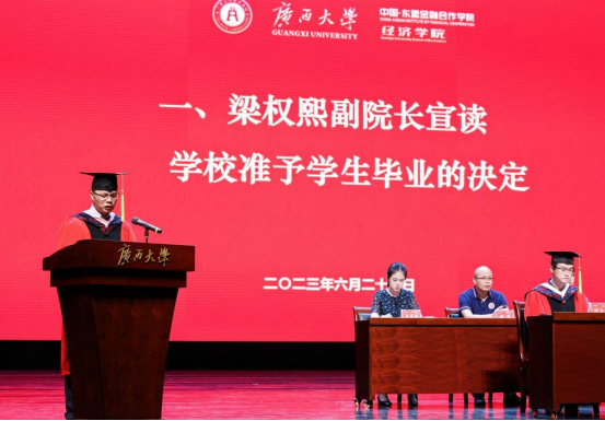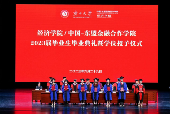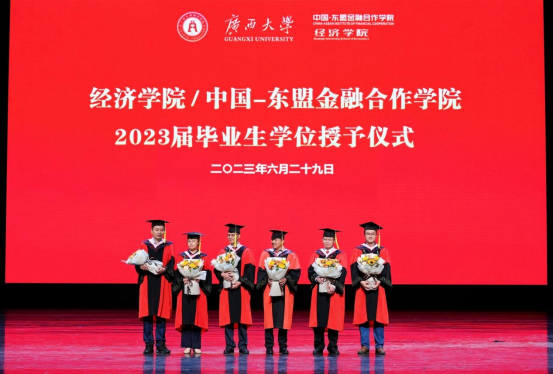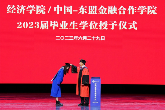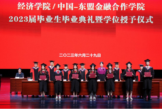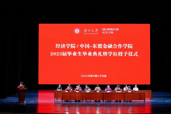 6月29日上午,太阳成tyc7111cc/中国-东盟金融合作公司2023届毕业生毕业典礼暨学位授予仪式在汇学堂大剧场隆重举行。公司党委书记陆善勇,经理李光辉,公司党委副书记陈卉娟,副经理谭春枝、梁权熙,教师代表曾海舰、刘主光、郭南芸、刘骞文、毛薇、杨璞、盛玉雪、陈伟宏、谢军、王玉洁、王海希、黄芸,以及毕业班班主任,研究生导师,各系、各办的老师出席典礼仪式。谭春枝副经理主持毕业典礼暨学位授予仪式。