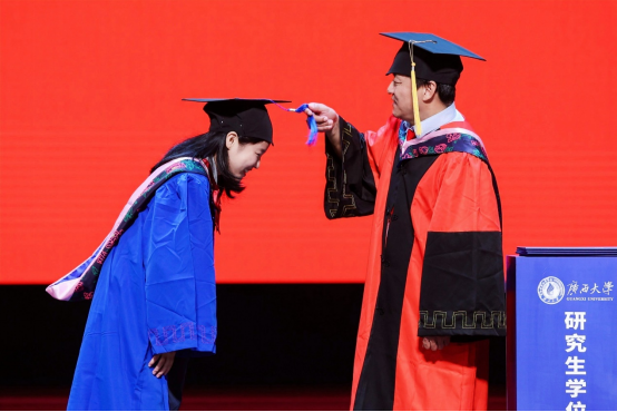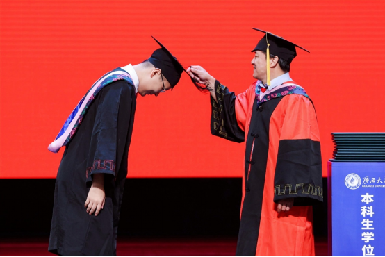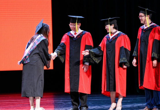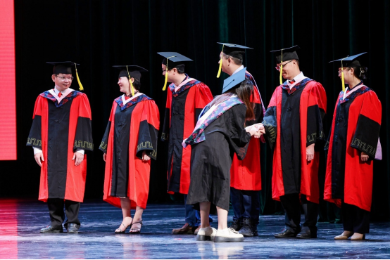 毕业典礼至此圆满结束,学位授予仪式正式开始。太阳成tyc7111cc第十四届学位委员会委员、太阳成tyc7111cc学位评定分委员会主席李光辉经理为2023届毕业生逐一拨穗、授予学位,公司学位评定分委员会各位委员在主席台上肃立见礼、与毕业生一一握手。