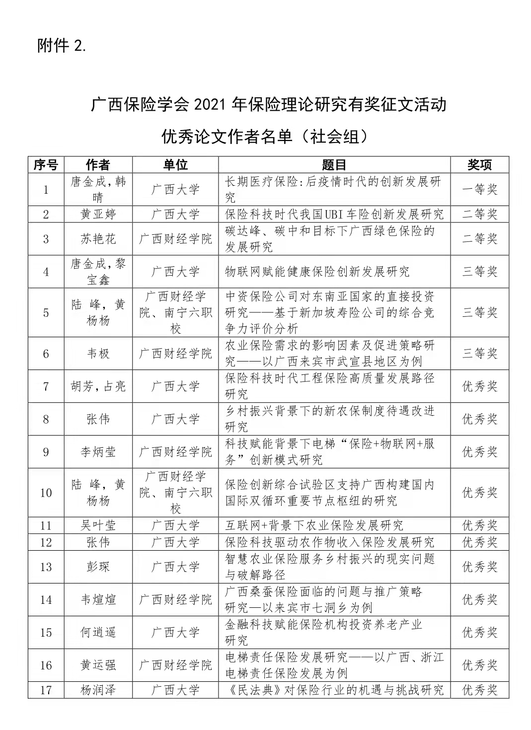 近日,广西保险学会公布2021年保险理论研究征文活动优秀论文作者及优秀组织单位,公司荣获优秀组织奖,同时,唐金成教授提交的论文获得一等奖、三等奖各一项,公司还获得二等奖一项,优秀奖七项的优异成绩,受到行业广泛好评。
