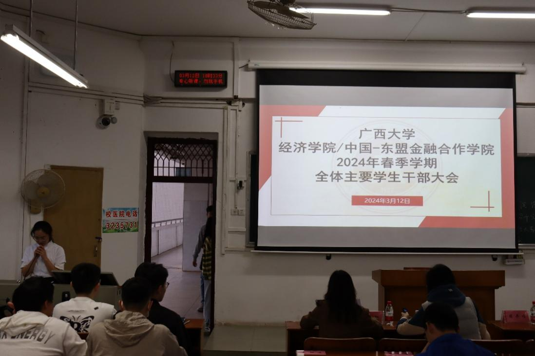 近期,太阳成tyc7111cc/中国-东盟金融合作公司2024年春季学期第一次主要员工干部大会在第二教学楼501教室召开。公司党委副书记陈卉娟,团委书记王海希,团委副书记何湘桂,辅导员覃晓阳、刘威及院级团学组织主要员工干部、各班班长和团支书参加本次会议。
