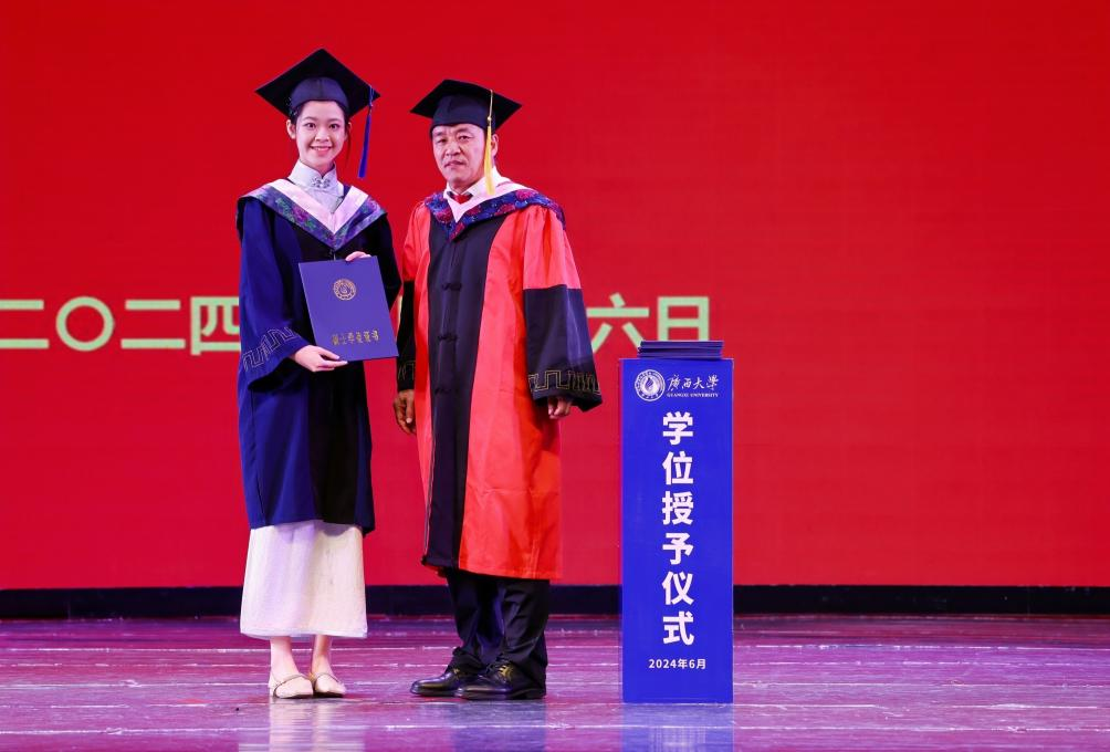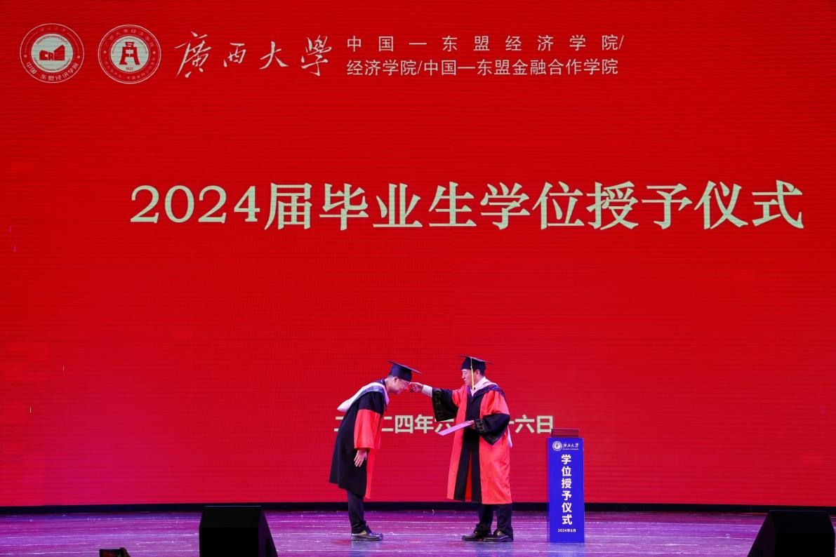 毕业典礼在雄壮的国歌声中拉开帷幕。典礼伊始,梁权熙副经理宣读公司准予员工毕业以及表彰优秀毕业生的决定;陈卉娟副书记宣读公司获得“2024届广西壮族自治区普通高等教育优秀毕业生”称号的毕业生名单;罗诚书记和李光辉经理为优秀毕业生代表颁发毕业证书、赠送毕业礼物。