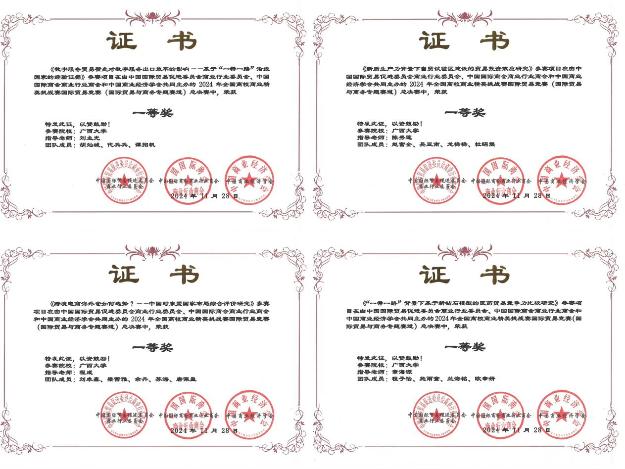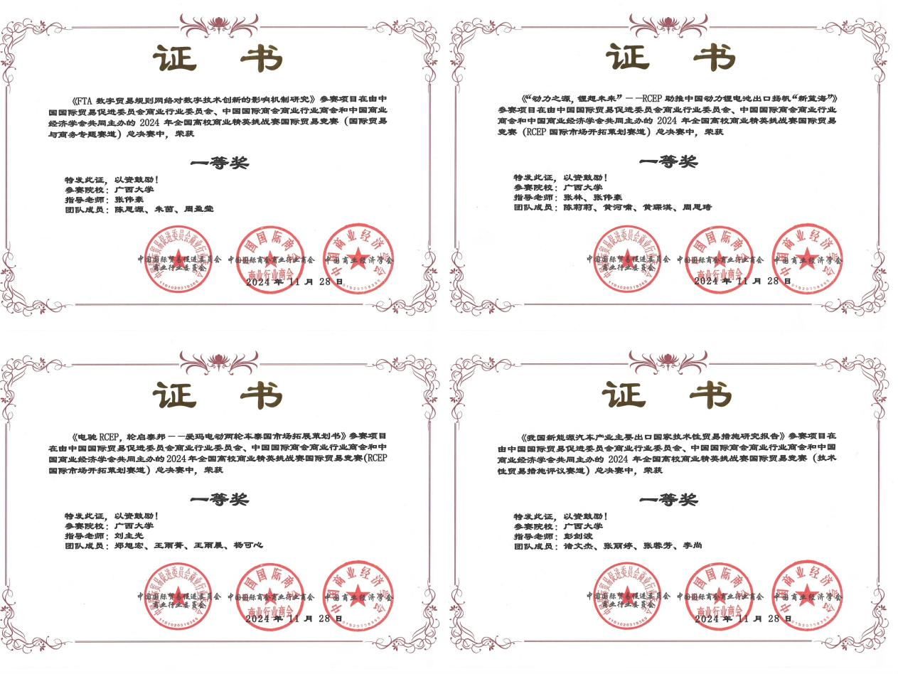 公司一直秉持着“根植广西,辐射东盟”的理念,致力于培育员工在国际经济与贸易领域内的前瞻性创新思维与宽广的全球视野。本次竞赛得到了太阳成tyc7111cc“研究生素质能力提升类项目”和公司的大力支持。公司师生们在比赛中取得的卓越成绩,不仅彰显了公司研究生深厚的专业知识功底、出色的实战能力和紧密的团队精神,也充分验证了公司在研究生教学与实践教育方面的显著成就,与学经理期坚持的“以赛促学、以学强赛、赛教融合”的理念及人才培养目标高度契合,标志着公司在培养具有国际竞争力的复合型人才方面又迈出了坚实的一步。