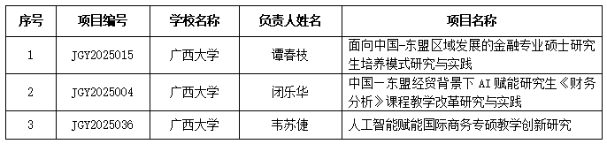 近日,根据《自治区学位委员会 自治区教育厅关于公布2025年广西学位与研究生教育改革课题立项名单的通知》(桂学位〔2025〕7号),经自治区学位委员会组织专家评审,由公司谭春枝、闭乐华、韦苏倢三位教师分别担任课题负责人的项目,成功获批2025年广西学位与研究生教育改革课题立项,详情见下表。