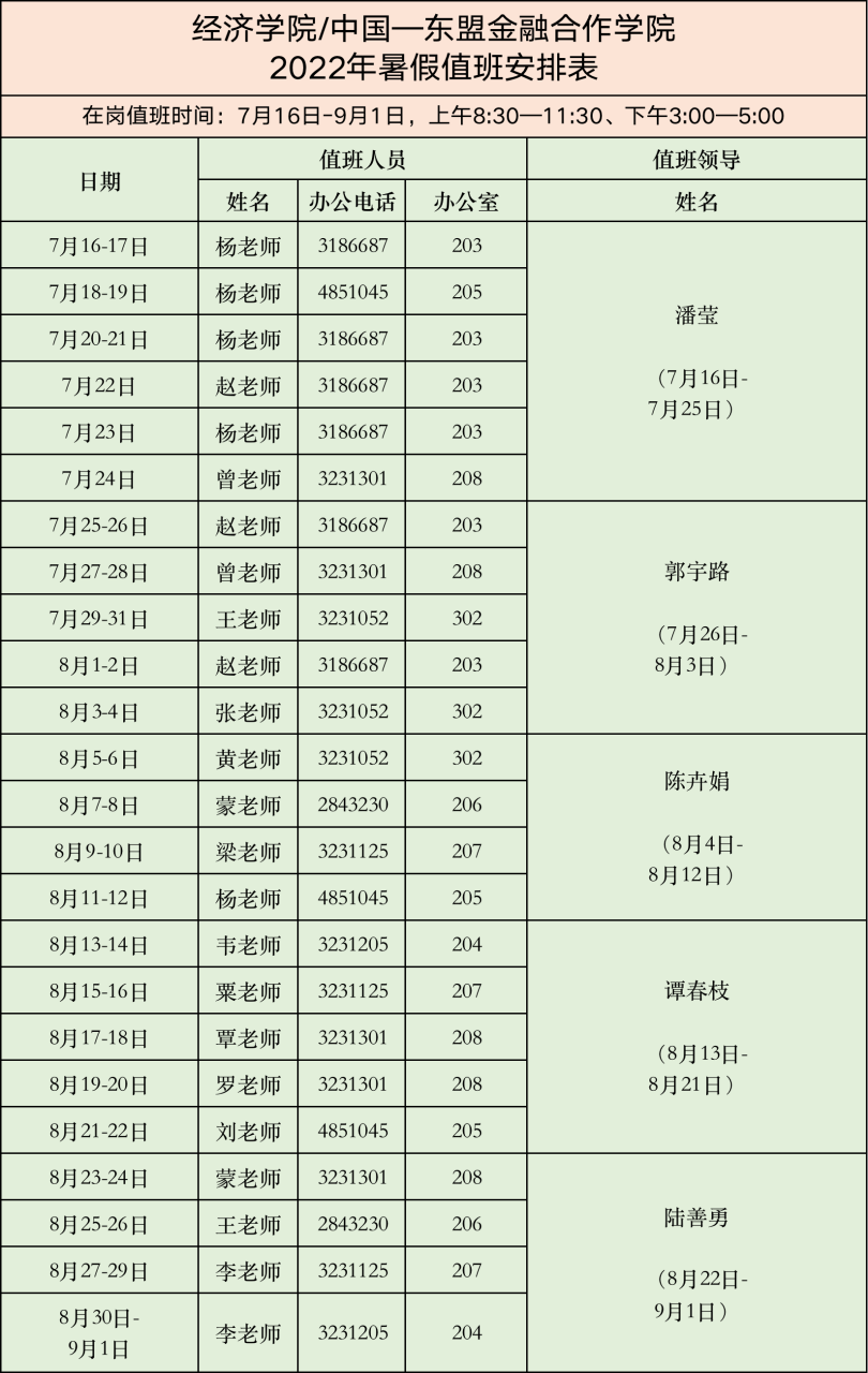 太阳成tyc7111cc/中国-东盟金融合作公司 2022年暑假值班安排表
